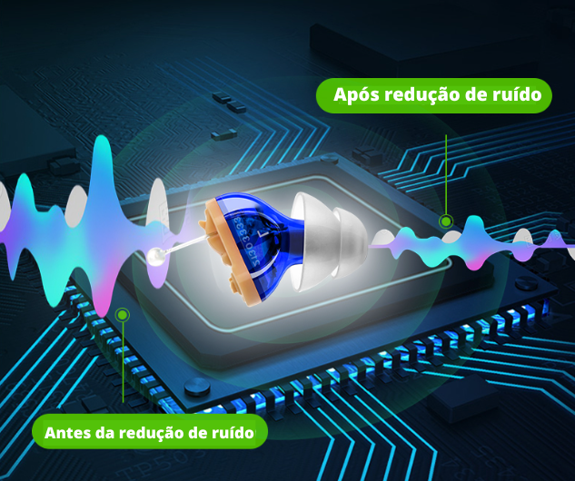 O Audien™ utiliza um chip digital sofisticado que distingue com precisão o ruído de fundo indesejado dos sons que o usuário deseja ouvir, proporcionando uma audição mais clara e sem interferências, mesmo em ambientes barulhentos.